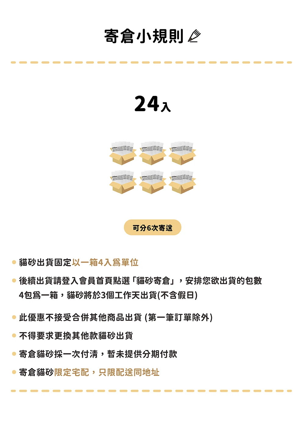 - 宅配 :多箱貓砂或訂單商品數量較多可能會拆成2件以上包裹配送